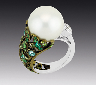 這些珠寶以非傳統(tǒng)的方式混合了不同的材質(zhì)和構(gòu)造,從而開啟了嶄新的篇章。就如同俄耳甫斯神奇的七弦琴,這些珠寶擁有催眠的魔力。也許,俄耳甫斯甜美的樂曲使得這些珍貴的鉆石和光亮的石頭瞞過賽壬和地下守護(hù)神的眼睛從而被藏匿起來。一個(gè)盤繞的以鉆石包裹的鑄造圓環(huán)被整齊纖細(xì)勻稱的黑色柱條套住,并以完美的白珍珠串固定。放射狀的月光石、鉆石和蛋白石組合暗示北方奶白色的天空,水晶組成的釘狀花瓣插入其間,結(jié)合形成仿古的花朵。最讓人喜歡的是一條以月光石珠子、珍珠、藍(lán)灰色尖晶石和鉆石渦旋串連起來的項(xiàng)鏈,它就像倒映在深夜冰冷海面上的漫天星斗一樣美麗?粗@些夢幻般的珠寶,靜靜的冥想,如同掉入它們的魔咒一般。