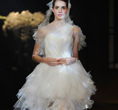 在日本首都東京的一場(chǎng)時(shí)裝展上,一名模特展示日本設(shè)計(jì)師松居惠里的作品。松居注重藝術(shù)和科技結(jié)合,曾于2009年帶領(lǐng)宇航服設(shè)計(jì)隊(duì)伍設(shè)計(jì)出零重力婚紗。