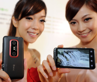 HTC(宏達國際電子股份有限公司)與臺灣大哥大在臺北聯(lián)合發(fā)布首款裸視3D手機HTC EVO 3D,讓消費者感受震撼的裸視3D效果。圖為模特在展示HTC首款裸視3D手機。