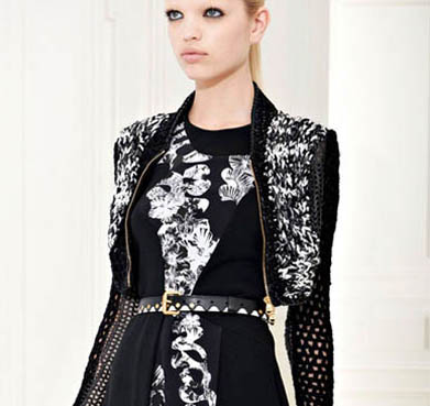 女郎顯得更加優(yōu)雅干練,網(wǎng)眼面料的輕盈感使皮裝不會顯得過于硬朗、沉重。復(fù)古緊身胸衣式的上半身輪廓、柔軟而富有曲線美的裙擺、細(xì)密閃亮的金屬扣環(huán)裝飾、清爽和諧的配色,融合成優(yōu)雅而富有藝術(shù)感的氣質(zhì)。連身裙則在不對稱剪裁上大做文章,肩部的挖空設(shè)計(jì)、不規(guī)則的裙擺將線條清晰的建筑感與裙裝的飄逸感融為一體,黑白條紋、棕櫚葉子和木槿花圖案作為裝飾,有幾分抽象畫的感覺。