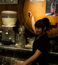 女招待身后那個(gè)巨大的橡木桶,里面盛著蘋果酒,蘋果酒并不像葡萄酒那樣會(huì)緩緩流出。由于酒桶內(nèi)的壓強(qiáng)較大,蘋果酒都是噴出來(lái)的,因此這要求招待一定要用杯子很準(zhǔn)的接在酒噴射到的地方。