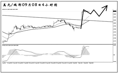 美元兌瑞郎在周二發(fā)生大幅上沖,消息方面的原因在于瑞士央行突然宣布設(shè)定歐元兌瑞郎的最低匯價為1.20,令市場措手不及。圖形上分析,匯價一舉突破了周線圖的下降壓力線,此壓力線始于去年5月底,匯價的筑底得到了進(jìn)一步的鞏固。由于這波上沖力度過猛,美元兌瑞郎需要一定的修正,為此后的再度上行做準(zhǔn)備。