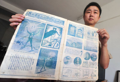 圖為彭偉在展示一件1930年出版的“湖北中山日報國慶紀念圖畫增刊”原件。