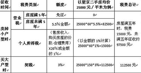 目前,二手房買賣時需要交納的主要稅費(fèi)為營業(yè)稅、個稅、契稅等,其中營業(yè)稅及個稅為房產(chǎn)交易時業(yè)主需要交納的部分,而契稅的征收對象則為購房者。以一位賣掉一套60平米的小戶型,再買一套150平米的大戶型的換房者為例,中間將產(chǎn)生哪些稅費(fèi)呢?我愛我家社區(qū)專家為您解析: