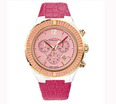 Versace設(shè)計(jì),顯示了靈感來(lái)自Versace范思哲2011秋冬時(shí)裝秀的高科技材料以及色調(diào):藍(lán)色、紫色、黑色和紅色。亞光黑色陶瓷表殼與藍(lán)色鋁質(zhì)表圈;藍(lán)色和紫色橡膠表帶,搭配紅色琺瑯表盤(pán)。