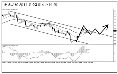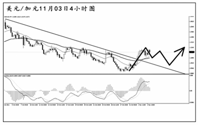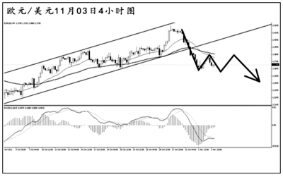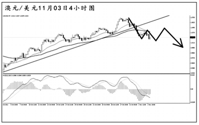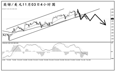 澳元兌美元的此波下跌將圖中的上升趨勢線跌破,均線系統(tǒng)已經(jīng)形成壓制排列。澳元重新挑戰(zhàn)1.1000的進程再度受阻,預計后市繼續(xù)發(fā)生下挫的概率較大。4小時圖MACD仍處于空頭動能充盈的階段。澳元若發(fā)生回調(diào),也很難重新升破趨勢線,操作上以小倉做空為主。