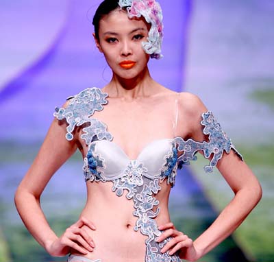 在“歐迪芬”杯2011中國(guó)內(nèi)衣設(shè)計(jì)大賽上,東北電力大學(xué)藝術(shù)學(xué)院學(xué)生成龍奪得金獎(jiǎng)。圖為模特在展示參賽作品。