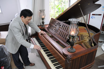 年逾六旬的館主陳恭是福建職業(yè)藝術(shù)學(xué)院的退休教師,年輕時(shí)畢業(yè)于上海音樂學(xué)院樂器制造專業(yè),他會(huì)制造樂器,尤其擅長(zhǎng)修復(fù)古董樂器。陳恭說:“我從事樂器研究、制作、維修已幾十年,積累了大量樂器制造、歷史和文化方面的知識(shí),我收藏這些樂器,就是為了要讓更多的人感受到樂器文化的美好。”圖為陳恭收藏的具有130多年歷史、純手工制造的德國漢諾威鋼琴。