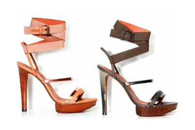 Lanvin 2012春夏鞋履系列堪稱性感中不失質(zhì)感的大氣之作。尖頭、超高跟、防水臺的鞋子,采用了木質(zhì)的防水臺,并在鞋跟上做了適當(dāng)?shù)狞c綴來滿足整雙鞋的造型需求。鞋面綴滿鉆飾的高跟鞋在鞋跟上也做了相應(yīng)的處理;裸色的涼鞋的鞋跟和防水臺統(tǒng)一采用了較深的色彩來壓住鞋子的重心。多種彩色蟒蛇紋的應(yīng)用都性感十足。