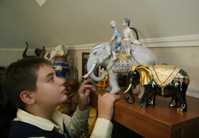 圖為大象迷菲莫維奇的兒子在家里擺弄收藏的大象工藝品。新華社發(fā)