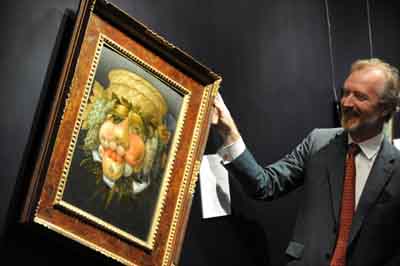 圖為預展上展示的2012年1月25日將在紐約佳士得拍賣會上拍賣的朱塞佩·阿爾欽博托的油畫《以水果構成的可逆轉(zhuǎn)男子肖像》,估價300萬至500萬美元。