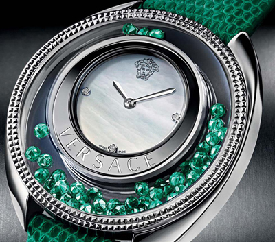 整整兩克拉的祖母綠寶石環(huán)繞著引人注目的白色珍珠貝母表盤,表盤十二點位置刻有Versace(范思哲)著名的Medusa美杜莎女神頭像,時標上鑲嵌有鉆石,這是一款引人入勝的驚艷之作。漂亮的不銹鋼表殼外圈以巴黎飾釘裝飾,搭配以與漂浮的祖母綠寶石顏色相一致的綠色蜥蜴皮表帶,更顯腕表的珍貴。