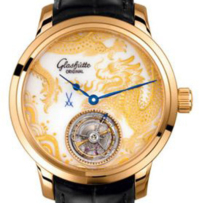 格拉蘇蒂(Glashütte Original ) 以超凡的梅森陀飛輪龍年限量腕表,迎接即將來臨的龍年。德國頂級(jí)制表廠格拉蘇蒂創(chuàng)制了八支獨(dú)一無二的時(shí)計(jì),每只均配備梅森瓷廠制作的陶瓷盤面,飾以人手繪制的精美龍形圖案,以含有純金粉的陶瓷顏料繪成。 經(jīng)高溫處理后,顏料緊附在表面上,呈現(xiàn)金色啞光;技藝高超的畫師繼而以瑪瑙筆為金龍加工,使之輪廓分明,耀眼生輝。