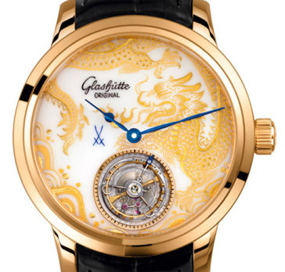 德國頂級制表廠格拉蘇蒂創(chuàng)制了八支獨一無二的時計,每只均配備梅森瓷廠制作的陶瓷盤面,飾以人手繪制的精美龍形圖案,以含有純金粉的陶瓷顏料繪成。經(jīng)高溫處理后,顏料緊附在表面上,呈現(xiàn)金色啞光;技藝高超的畫師繼而以瑪瑙筆為金龍加工,使之輪廓分明,耀眼生輝。
