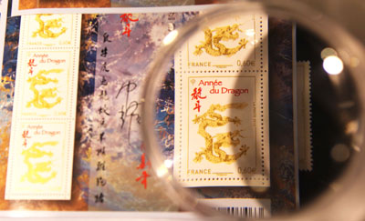 為迎接中國農(nóng)歷新年的到來,法國郵政總局1月6日在巴黎發(fā)售中國龍年生肖紀(jì)念郵票。2005年,法國郵政總局首次發(fā)行了由法國華人藝術(shù)家李中耀與法國藝術(shù)家合作完成的中國農(nóng)歷紀(jì)念生肖雞年郵票,此后又陸續(xù)發(fā)行了狗年、豬年、鼠年、牛年、虎年和兔年生肖紀(jì)念郵票,吸引了大批集郵愛好者購買。記者 高靜/攝