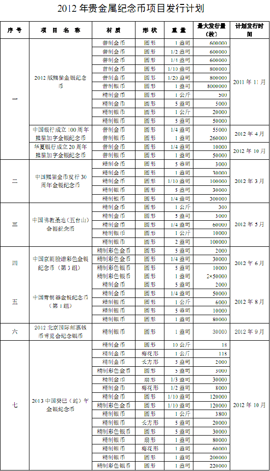 經(jīng)中國人民銀行批準,2012年貴金屬紀念幣計劃發(fā)行7個項目,50個品種,其中金幣27個品種,銀幣23個品種。