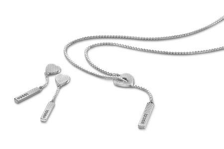 該系列的中心亮點是Gucci常用的心形圖案,這在已有的銀飾系列中經(jīng)常見到。優(yōu)雅的耳環(huán)吊墜上刻有心形圖案,而帶有鎖眼開口的心形純銀吊墜則在lariat風(fēng)格的纖細項鏈上熠熠生輝。精致的項鏈穿過心形吊墜中心環(huán)繞固定,耳環(huán)與這個流暢的輪廓遙相呼應(yīng),同樣帶有優(yōu)雅的長鏈。