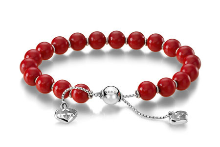 手鏈由紅漆木的圓珠串成,點綴純銀隔斷。流暢的滑扣用于鎖閉手鏈,梨形的銀質(zhì)鎖扣和兩個心形銀片更為其增色不少。佩戴手鏈時可松可緊,這要歸功于這個流暢的滑扣。