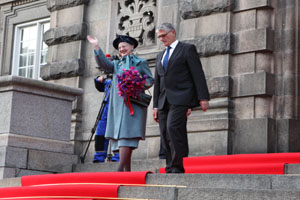 整個(gè)慶典活動(dòng)在今年的1月14日和15日進(jìn)入高潮,丹麥的政要人物和歐洲其他國(guó)家的王室成員紛紛到場(chǎng),向瑪格麗特二世表示祝賀。特別值得一提的是,女王與丈夫亨里克親王在14日乘坐四輪馬車,在48名皇家衛(wèi)兵組成的護(hù)衛(wèi)隊(duì)的護(hù)送下從阿馬林堡王宮出發(fā),在哥本哈根市中心地帶游行。女王所乘坐的皇家馬車是所有皇家馬車中級(jí)別最高的和歷史最悠久的,它建造于1842年,表面鍍了24K金,只在非常重要的場(chǎng)合使用。當(dāng)日,數(shù)萬(wàn)丹麥民眾頂著寒流,聚集在阿馬林堡宮廣場(chǎng)和游行的終點(diǎn)市政廳廣場(chǎng),不少民眾陪同女王的車隊(duì)走在街頭,走完全程,向他們所愛戴的女王表示忠誠(chéng)和祝賀。