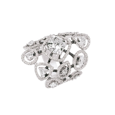 全新頂級(jí)珠寶系列將這個(gè)精髓發(fā)揮至極,種種對(duì)比元素自由地奇妙組合,帶來無以言喻的視覺沖擊:既形象生動(dòng)又感性魅惑,既有強(qiáng)烈的結(jié)構(gòu)感又流動(dòng)變幻。色彩的運(yùn)用同樣大膽,出其不意地打破色調(diào)的平衡,卻由此締造獨(dú)一無二的和諧。圓形和不規(guī)則幾何形隨性碰撞,光影迭映,交織出如夢(mèng)如幻的協(xié)調(diào)韻律。