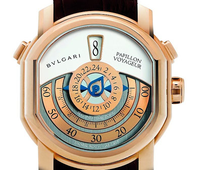 寶格麗 Papillon Voyageur ,DR1307機械式自動上煉機芯 ,跳時,Papillon 分鐘顯示,中央指針雙時區(qū)顯示,以及專屬