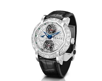 格拉夫奢華腕表隆重為您介紹MasterGraff腕表系列的最新作品。表殼直徑48毫米的雙陀飛輪GMT鉆石腕表整體共鑲嵌超過(guò)30克拉的鉆石,飾以品牌標(biāo)志性的鉆石刻面表圈,將鉆石的華麗及高級(jí)腕表制作結(jié)合得淋漓盡致。