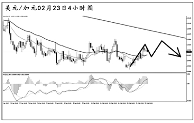 美元兌加元周初跳空低開之后持續(xù)反彈,匯價逐步向道氏高點阻力1.0050一線靠近。4小時圖匯價處于明顯的震蕩走勢之中,在道氏高點被升破之前,做多都屬于逆勢博弈的機會。預計后市匯價有望沖擊下降壓力線1.0080附近阻力,只有升破方可結束階段性的下跌趨勢。