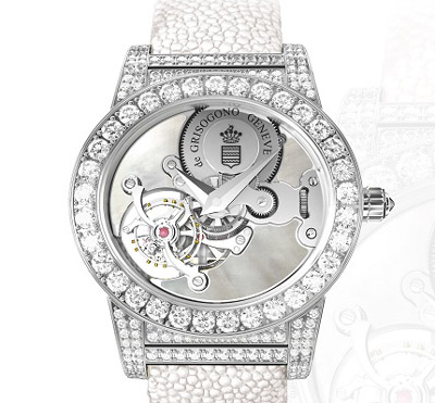 GRISOGONO又一件珠寶腕表杰作,也品牌第一款陀飛輪腕表。這全新型號(hào)包括有白鉆、黑鉆及啡鉆三個(gè)款式。閃耀的白鉆包圍著發(fā)亮般的貝母表面,配上優(yōu)雅的陀飛輪表橋曲線及大膽的設(shè)計(jì),是