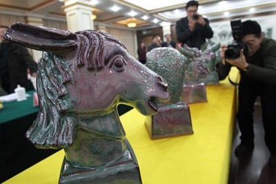 日前,中國鈞瓷十二獸首新聞發(fā)布暨作品研討會在河南許昌市舉行。據(jù)悉,中國鈞瓷十二獸首鐫刻圓明園標(biāo)志,經(jīng)圓明園管理處授權(quán)制作、監(jiān)制,限量制作151套,編號從1860到2011,紀(jì)念自1860年英法聯(lián)軍火燒圓明園到2011年的151年歷史。編號1860的作品由圓明園管理處永久收藏。 圖為中國鈞瓷十二獸首在河南許昌迎賓館亮相。新華社發(fā)