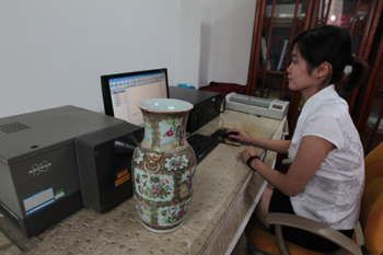 工作人員在用脫;Y(jié)構(gòu)分析法對(duì)瓷器的年代進(jìn)行數(shù)據(jù)分析!懊摬;蓖ㄟ^(guò)對(duì)瓷器釉面微觀物質(zhì)結(jié)構(gòu)的測(cè)試可以確定釉質(zhì)結(jié)構(gòu)變化的程度、推測(cè)釉質(zhì)最后燒成的年代,以此來(lái)判斷器物的年代。記者