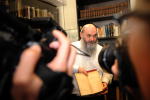 3月19日,耶路撒冷希伯來大學(xué)愛因斯坦檔案館館長(zhǎng)羅尼·格羅斯在愛因斯坦私人圖書館內(nèi)向記者展示藏書。愛因斯坦私人圖書館于1987年搬到了耶路撒冷。記者
