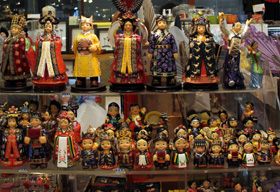 到仁寺洞旅游的外國游客,一定會被這里遍布各處的文化商品所吸引,就連已經(jīng)去過無數(shù)次的我,面對各種精致可愛的工藝品,也常常流連忘返。仁寺洞最受歡迎的商品要數(shù)陶器,英國伊麗莎白女王曾經(jīng)訪問過這里的“樸英淑窯”。改良的生活韓服也在仁寺洞大行其道,美麗精致的設計總令女顧客們愛不釋手。除此以外,物美價廉的韓國傳統(tǒng)生活用品也極受歡迎,漂亮的綢緞荷包、扇子和韓國結手機鏈等都是送禮佳品。熱愛古籍的朋友們,則在彌漫著書香的古籍一條街里久久駐足。