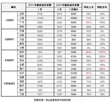 據(jù)偉業(yè)我愛我家市場研究院的數(shù)據(jù)統(tǒng)計,3月份,新房成交量環(huán)比漲幅前三的城市分別是杭州上漲464%,長沙上漲191%,廣州上漲183%;新房成交量同比漲幅前三的城市分別是杭州上漲1567%,蘇州上漲388%,廈門上漲288%。杭州的新房成交量漲幅不管是環(huán)比今年2月份,還是與去年同期相比,漲幅均領跑全國。