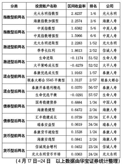 根據(jù)華寶證券統(tǒng)計(jì),4.17日-4.24日,投連險(xiǎn)各賬戶跟隨大盤(pán)取得了較好收益,所有賬戶整體取得0.64%的平均收益,絕大部分賬戶實(shí)現(xiàn)正收益。但關(guān)注度較高的激進(jìn)型賬戶平均收益仍未跑贏滬深300指數(shù)。