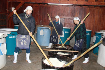 工作人員手持的長竹竿前固定有一塊厚木塊,這就是攪拌的工具。而制作酒母的最大看點(diǎn)就是工作人員一邊攪拌一邊唱《釀酒歌》。歌曲長達(dá)13段,“利根川水源流長,清泉涌出釀瓊漿……”吉慶的歌詞讓煩躁單調(diào)的工作充滿樂趣,還有一個(gè)功效是可以用歌曲來估算攪拌的時(shí)間,真正將勞動與藝術(shù)結(jié)合在一起。隨著不斷攪拌,大木盆內(nèi)的蒸米飯、酒曲結(jié)合在一起,變成了黏糊狀。
