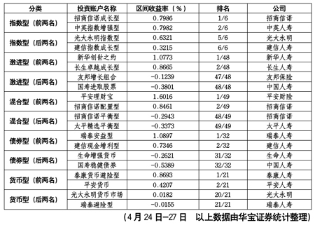 華寶證券統(tǒng)計,4月24日-4月27日,大部分投連險賬戶延續(xù)上揚趨勢,整體取得0.33%的平均收益,其中91.7%的賬戶實現(xiàn)正收益。但仍有國壽進取股票、友邦增長組合等多個賬戶以區(qū)間負(fù)收益的表現(xiàn)在各類型投連險賬戶中墊底。