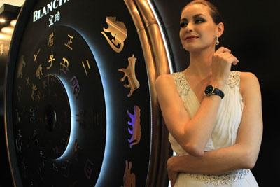 寶珀近日在北京舉行新聞發(fā)布會(huì),正式發(fā)布全球首款“中華年歷腕表”,該款腕表研發(fā)歷時(shí)5年,表上鑲有39枚寶石,擁有430余個(gè)部件的新型自動(dòng)上鏈復(fù)雜機(jī)械機(jī)芯,將西方傳統(tǒng)太陽(yáng)歷法與中國(guó)農(nóng)歷相結(jié)合。圖為模特在中華年歷腕表模型旁展示寶珀出品的腕表。