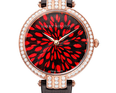 Winston旗艦店正門(mén)的新古典主義風(fēng)格拱門(mén)。獨(dú)一無(wú)二的表盤(pán)點(diǎn)綴著16世紀(jì)風(fēng)靡于歐洲的羽毛鑲嵌裝飾,這些羽毛裝飾由精通羽毛加工技術(shù)的手工藝師Nelly