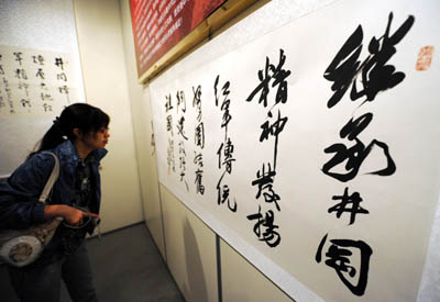 近日,為紀(jì)念井岡山革命根據(jù)地創(chuàng)建85周年和《中國書法》創(chuàng)刊30周年,由中國書法家協(xié)會(huì)征集的謝云、劉藝、李鐸等百名全國著名書法家的100件書法作品在江西井岡山革命博物館展出,為期3天的展覽結(jié)束后,這些作品將全部由井岡山革命博物館收藏并永久陳列。圖為游客在井岡山革命博物館參觀展出的書法作品。