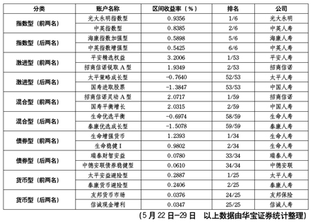 根據(jù)華寶證券統(tǒng)計,5月22日-5月29日,投連險各賬戶普遍跟隨大盤取得正收益,各投連險賬戶平均區(qū)間收益為0.47%。然而,仍有5%的賬戶區(qū)間實現(xiàn)負(fù)收益,其中泰康人壽旗下的泰康優(yōu)選成長型賬戶以-1.5078%的區(qū)間收益率在所有納入統(tǒng)計的177個投連險賬戶中墊底。