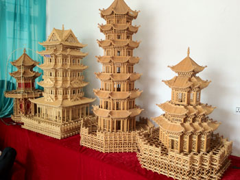 走進徐老漢家的客廳,里面儼然一個中國古代著名建筑微型展覽室,故宮角樓、天安門城樓、滕王閣、黃鶴樓等,老人說,這些古代建筑他只要能夠到現(xiàn)場看上幾眼,就能用高粱稈扎刻出來。