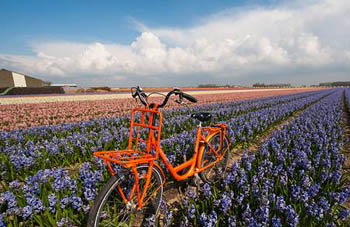 范戴姆大叔的家在De Bollenstreek,這是一個小鎮(zhèn),門口一輛巨大的橙色自行車便是標志。每年一到3月,范戴姆大叔便開始忙碌起來,他的自行車租賃店“Rent-a-Bike”就在著名的庫肯霍夫花園門口。庫肯霍夫花園一年只開放兩個月,每年都吸引幾十萬游客光臨,而其中很多人會選擇在晴朗的天氣租輛自行車騎行在花田中。