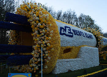 路上看到不少騎著范戴姆大叔家橙色自行車游覽的游客,有時看到有客人迷路了,范戴姆大叔還會停下車子給他們指路。范戴姆大叔有四個兒子,“他們從小就習慣騎自行車,有時每天騎十幾公里”。他的夫人瑪格麗特是這一帶有名的園藝師,還在日本教過園藝和插花,敻覃愄馗嬖V我,這一帶的花農(nóng)主要靠出售球莖為生,像郁金香這樣的鮮花在攝氏10度以內(nèi)可以保存較長時間,如果溫度高于15度或者下雨,花就會很快凋謝,如果花朵衰敗入土,會給球莖帶來病菌,因此需要及時摘去花朵,以利球莖長大。而大批“廢棄”的花朵用來做花車正好“變廢為寶”,花車游行于是成為這一地區(qū)的傳統(tǒng)“節(jié)目”,每年都會吸引數(shù)十萬的游客前來觀賞。