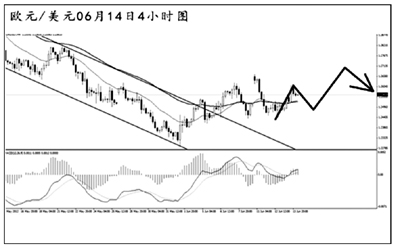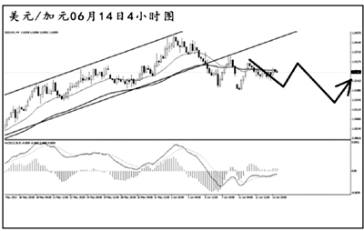 英鎊兌美元于上周后半段升破下降壓力線之后一直未能再創(chuàng)新高,短線上漲動能不足。4小時圖的道氏高點(diǎn)阻力在1.5725一線,從目前英鎊的反彈力度來看,短時間能夠順利升破此位置并不可期。英鎊仍有向下回探趨勢線支撐的風(fēng)險(xiǎn),關(guān)注1.5400一線的支撐強(qiáng)度。