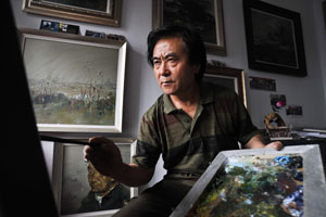 貴陽茅草壩職業(yè)畫家村的籌辦者之一、畫家馮志強(qiáng)在自己的工作室內(nèi)作畫。 |