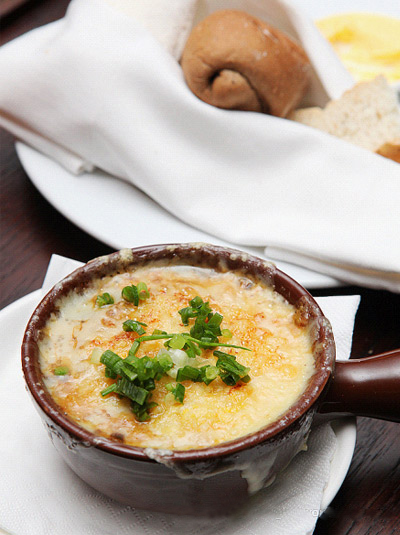 與多數(shù)國人心印象中過于精致的法式料理不同,這里的菜肴很適合分享。法式洋蔥湯是店家引以為豪的招牌美食,洋蔥熬煮至軟爛的口感,極為濃郁的香氣被逼出,表面以厚厚一層焗芝士覆蓋,再撒上香蔥,越發(fā)香濃;冷切的拼盤中的帕爾瑪火腿和薩拉米肥瘦分明,充滿迷人的油脂香,所搭配的自制豬肝醬以干邑和檸檬汁去腥鎖鮮,無論是和烤面包還是腌肉都屬極妙的組合。