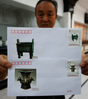 為迎接7月9日中國國家博物館建館100周年紀(jì)念日,中國郵政正式發(fā)行“國家博物館”票中票特種郵票一套2枚,名為:館藏文物—尊、館藏文物—鼎;面值分別為:1.20元、3元。