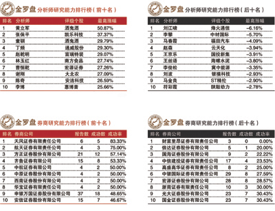 根據(jù)搜狐金羅盤(pán)的統(tǒng)計(jì)結(jié)果,在7月份261位分析師發(fā)布的473份評(píng)級(jí)為“買入”或“強(qiáng)烈推薦”的到期研究報(bào)告中,宏源證券分析師黃立軍所推薦的個(gè)股逆市飆升,表現(xiàn)可圈可點(diǎn);而財(cái)富里昂證券7月薦股無(wú)一成功,研究能力受到質(zhì)疑;中信建投薦股成功率不足四分之一,表現(xiàn)很不靠譜。