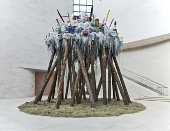在惠特沃思藝術(shù)館展出的作品中,著名喀麥隆藝術(shù)家帕斯卡爾·馬丁·泰尤專門為本次藝術(shù)展創(chuàng)作的大型室內(nèi)雨林作品《世界分崩離析》,將傳統(tǒng)非洲雕塑和象征物質(zhì)財富的日常雜物有機組合,模糊了貿(mào)易商品同神圣事物之間的區(qū)別和邊界,體現(xiàn)了作者在世界經(jīng)濟文化交流的背景下,對非洲社會、傳統(tǒng)文化和生活造成影響的思考與困惑。
