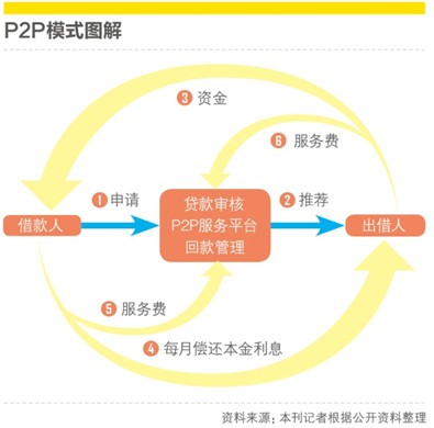 與我們熟悉的民間借貸形式—把錢直接借給熟識的朋友或親戚,讓對方寫下欠條,約定還款時間,有時還會約定不同利率,民間借貸公司就是在民間借貸過程中增加了中介信息平臺,這些公司作為中介,將民間的借款人和出借人對接,形成P2P借貸模式。P2P是peer